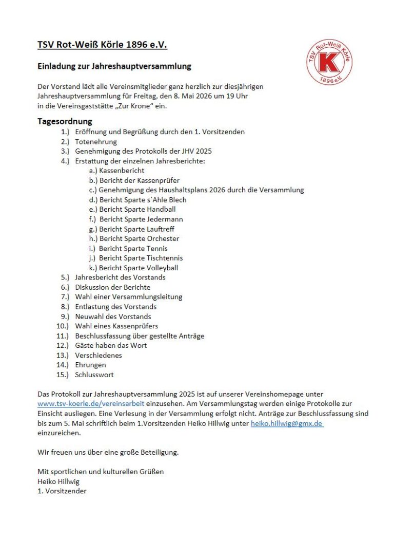 Einladung zur JahreshauptversammlungAm Freitag, den 9. Mai 2025, findet um 19:00 Uhr in der Vereinsgaststätte„Zur Krone“ die Jahreshauptversammlung des Hauptvereins statt. Tagesordnung Eröffnung und Begrüßung durch den 1. Vorsitzenden Ehrung verstorbener Vereinsmitglieder Genehmigung Protokoll 2024 Erstattung der einzelnen Jahresberichte: Kassenbericht Bericht der Kassenprüfer Genehmigung des Haushaltsplans 2025 durch die Versammlung Bericht Sparte s`Ahle Blech Bericht […]
